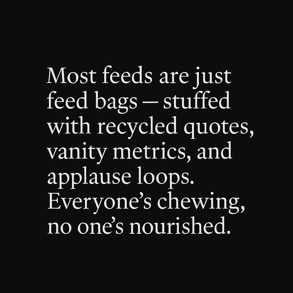 Scroll long enough and you’ll see why — vanity metrics, applause loops, borrowed “inspiration” spoon-fed back to the same audience.